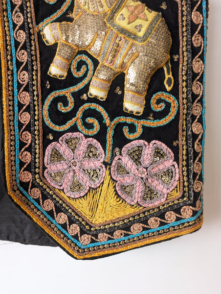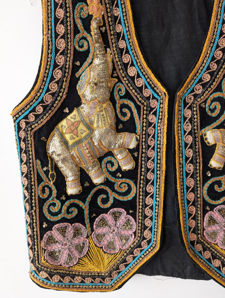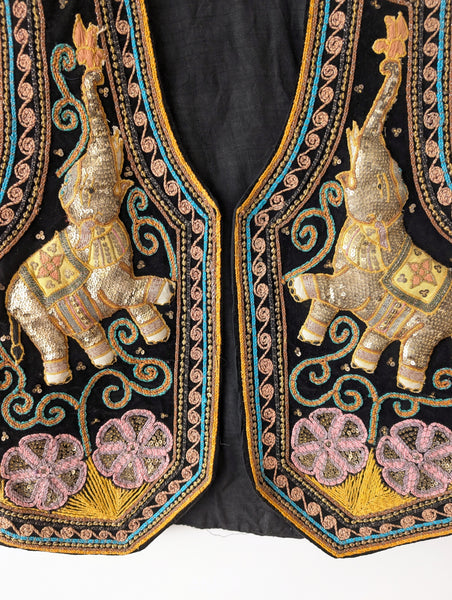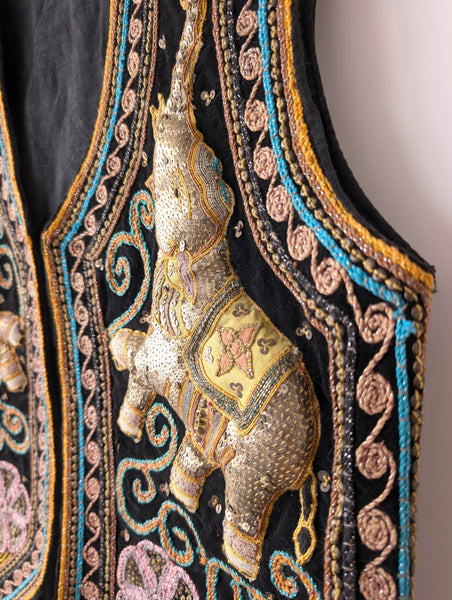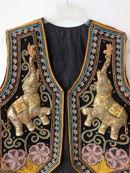 Die Weste ist aus Samt und hat liebevoll handbesickte Elefanten und Muster aus hunderten Perlen und Pailletten. RARE!