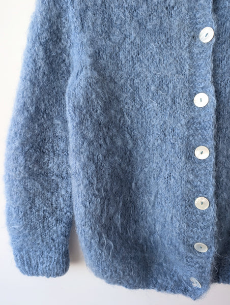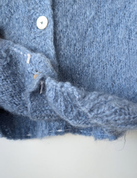 Schöne strukturierte Wolle durch Mohairanteil, sehr guter Vintage Zustand! Ein Gummizug wurde im Saum eingenäht, dadurch sitzt der Cardigan wie ein Blouson!